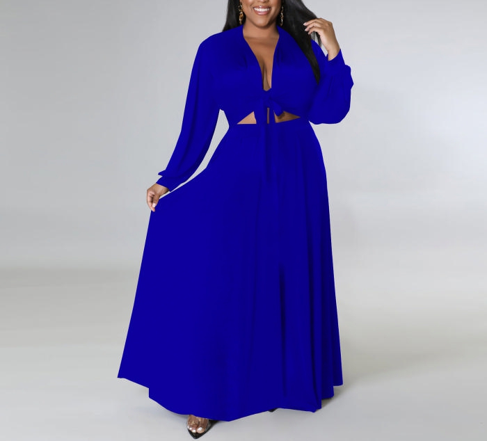 (Plus Size)(Blue)2022 Styles Women Fashion Summer TikTok&Instagram Styles Front Tie Solid Color Maxi DressSKU: #XF13432-3