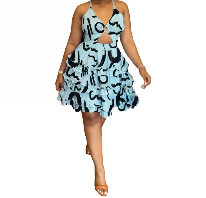 (Plus Size)(Blue)2023 Styles Women Sexy&Fashion Spring&Summer TikTok&Instagram Styles Print Ruffle Hem Mini DressSKU: #XF27396-2