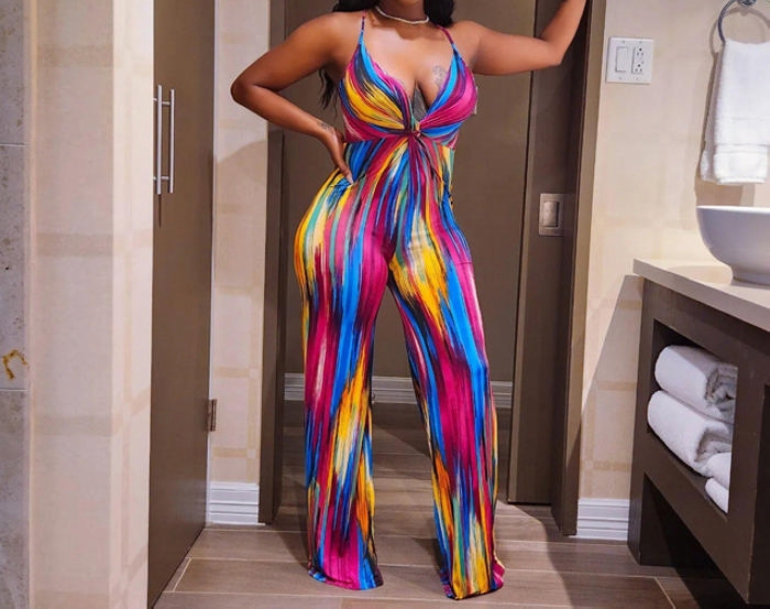(Plus Size)(Blue)2023 Styles Women Sexy&Fashion Spring&Summer TikTok&Instagram Styles Print Strap JumpsuitSKU: #XF27402-2