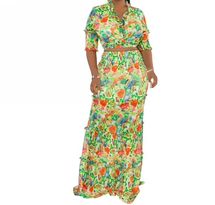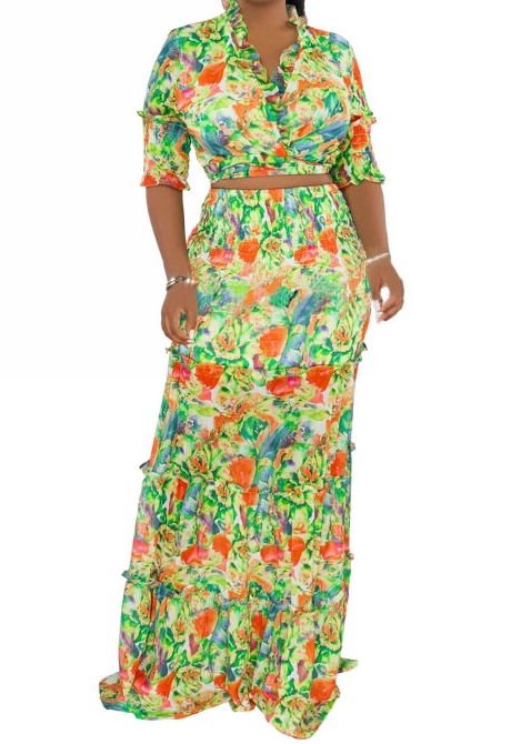 (Plus Size)(Green)2023 Styles Women Sexy&Fashion Spring&Summer TikTok&Instagram Styles Floral Print Loose Maxi DressSKU: #XF27390-2