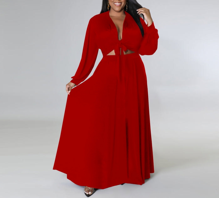 (Plus Size)(Red)2022 Styles Women Fashion Summer TikTok&Instagram Styles Front Tie Solid Color Maxi DressSKU: #XF13432-2