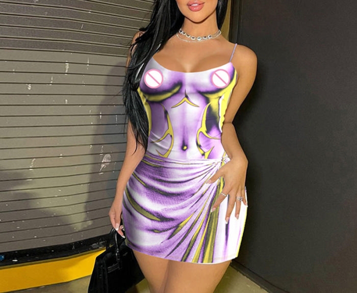 (Purple)2023 Styles Women Sexy&Fashion Spring&Summer TikTok&Instagram Styles Print Strap Mini DressSKU: #CF22929-2