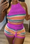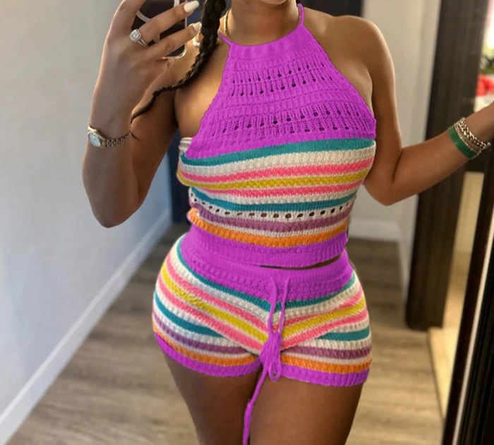 (Purple)2024 Styles Women Contrast Color Summer Sweater Short Two Piece SuitSKU: #OU2949-3