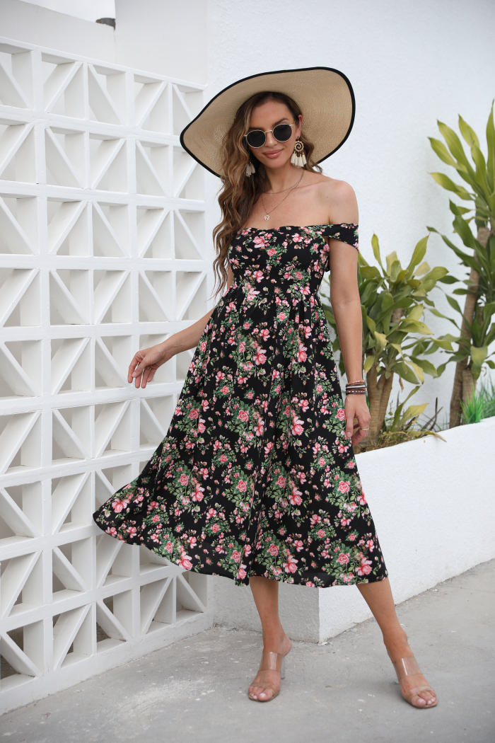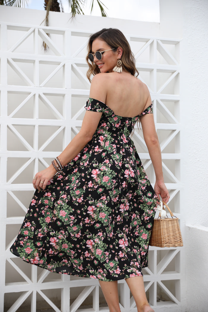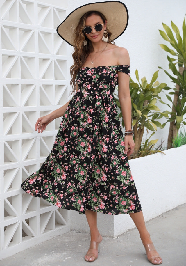 (Real Image)2022 Styles Women Fashion INS Styles Black Floral Off Shoulder Bohemian Maxi DressSKU: #CF09034-1