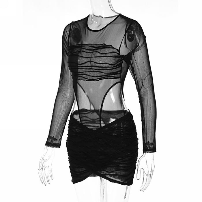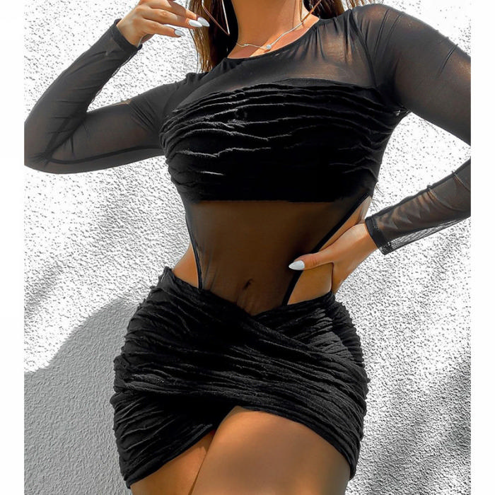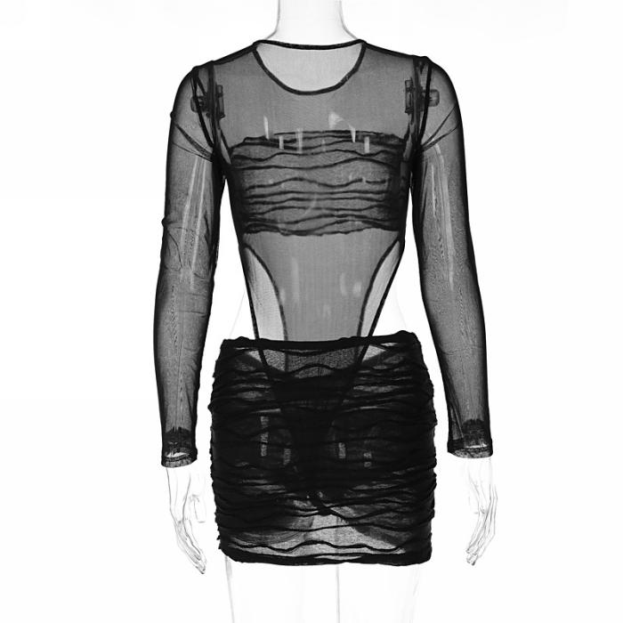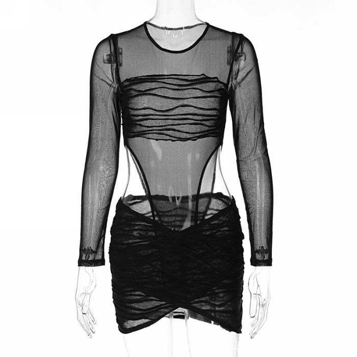 (Real Image)2022 Styles Women Fashion INS Styles Black Mesh Bodysuit+Skirts Two Piece DressSKU: #CF22722-1