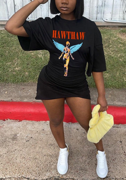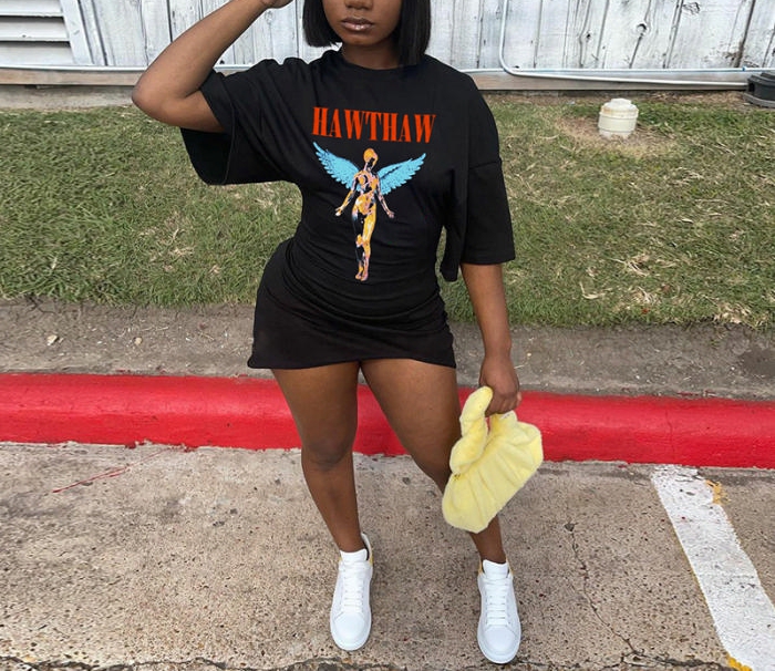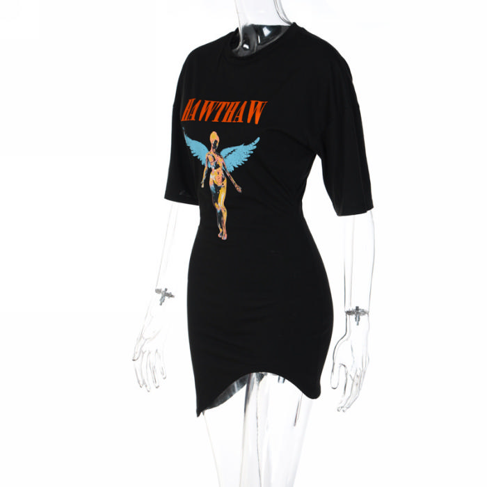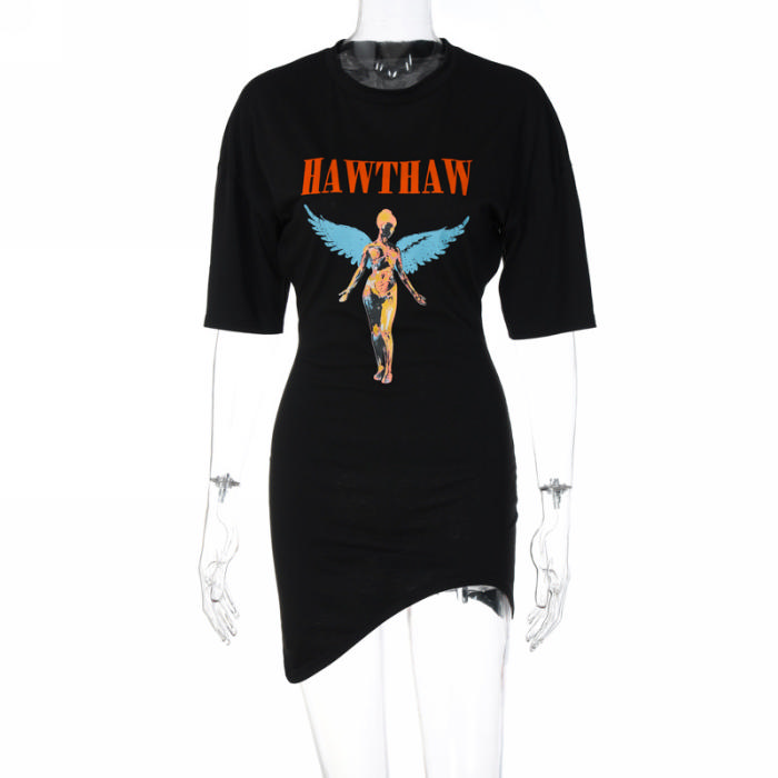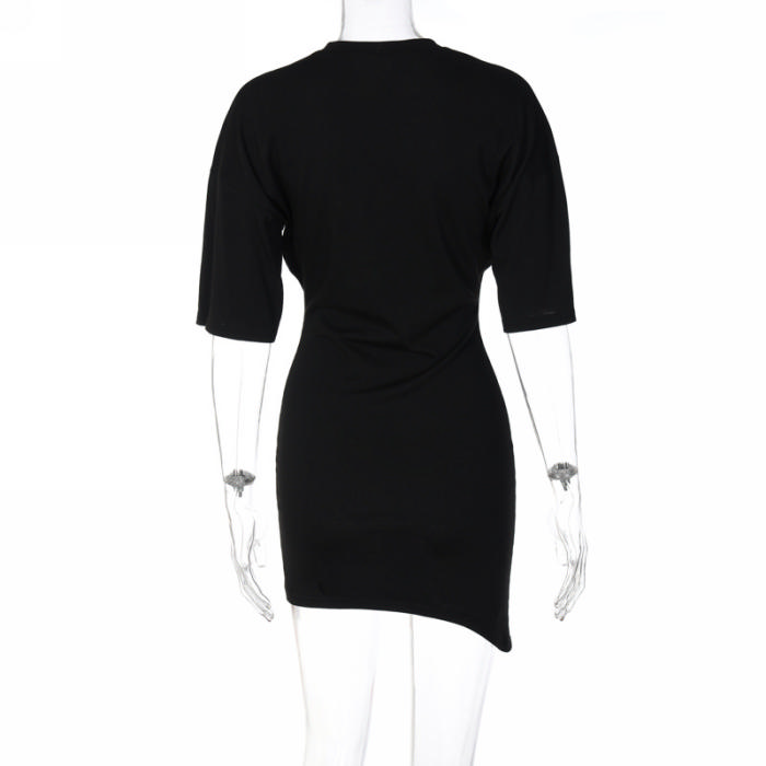 (Real Image)2022 Styles Women Fashion INS Styles Black Print Short Sleeve Irregular Mini DressSKU: #CF22676-1