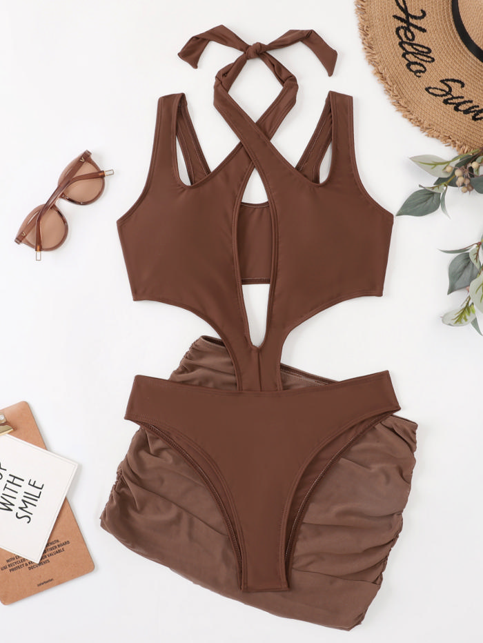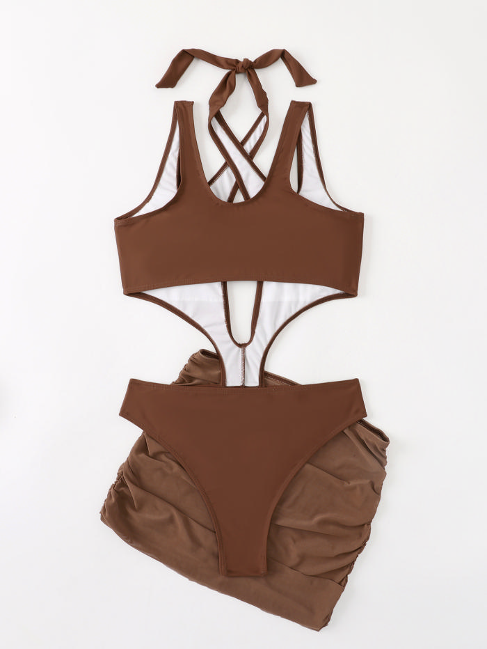 (Real Image)2022 Styles Women Fashion INS Styles Brown One Piece Swimwear + Skirts 2 Piece SwimsuitSKU: #CF31177-1