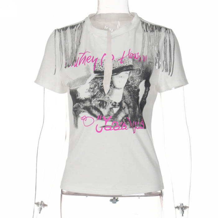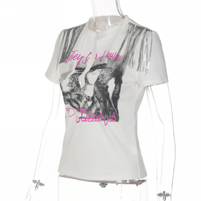 (Real Image)2022 Styles Women Fashion INS Styles Double Shoulder Tassel TeeSKU: #CF22603-2