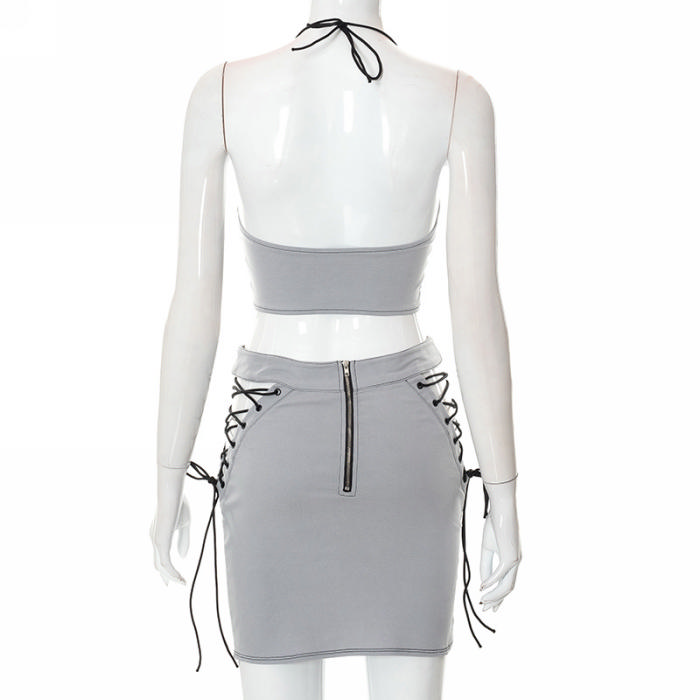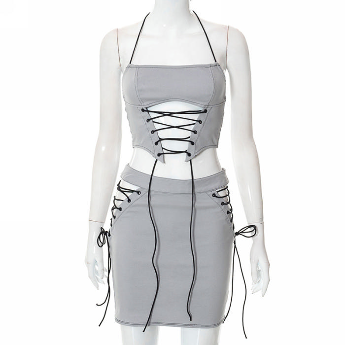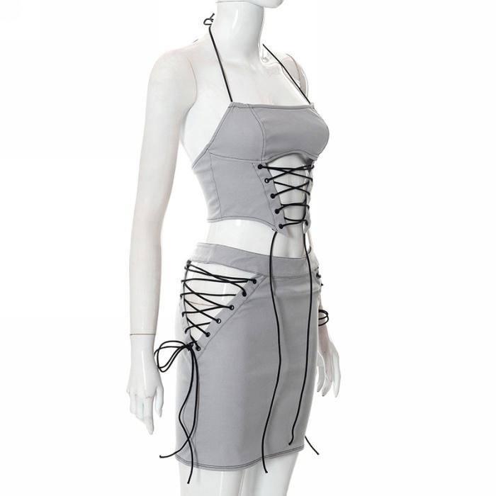 (Real Image)2022 Styles Women Fashion INS Styles Gray Lace Up Two Piece DressSKU: #CF68008-1