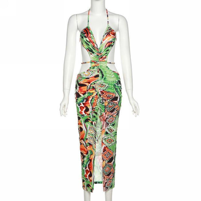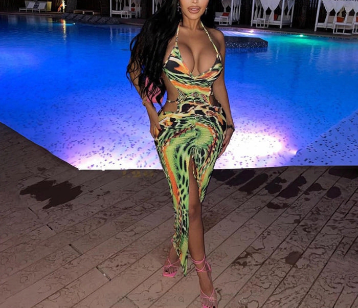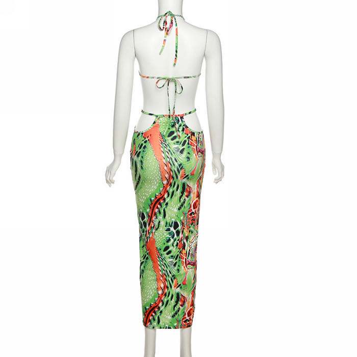 (Real Image)2022 Styles Women Fashion INS Styles Green Print Tie Maxi DressSKU: #CF12329-1