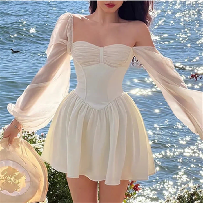 (Real Image)2022 Styles Women Fashion INS Styles Mesh Hem Off Shoulder Mini DressSKU: #CF08809-1