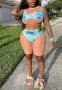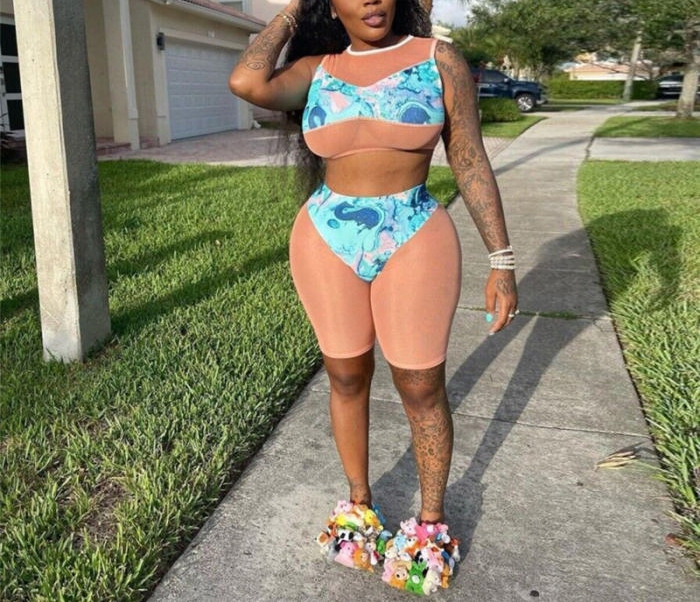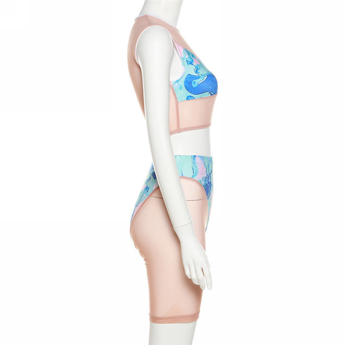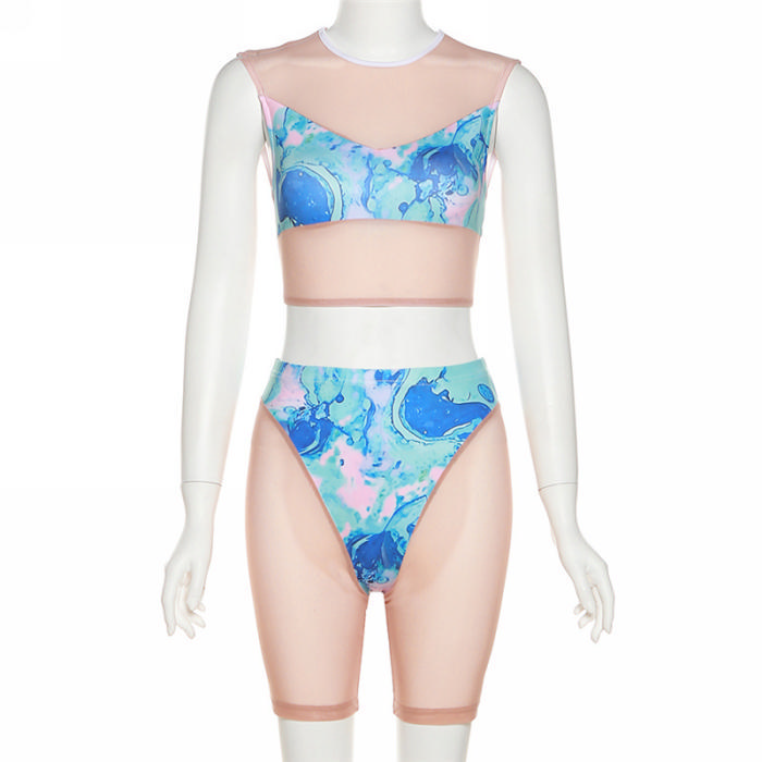 (Real Image)2022 Styles Women Fashion INS Styles Mesh Print Blue Short Two Piece SuitSKU: #CF49840-1