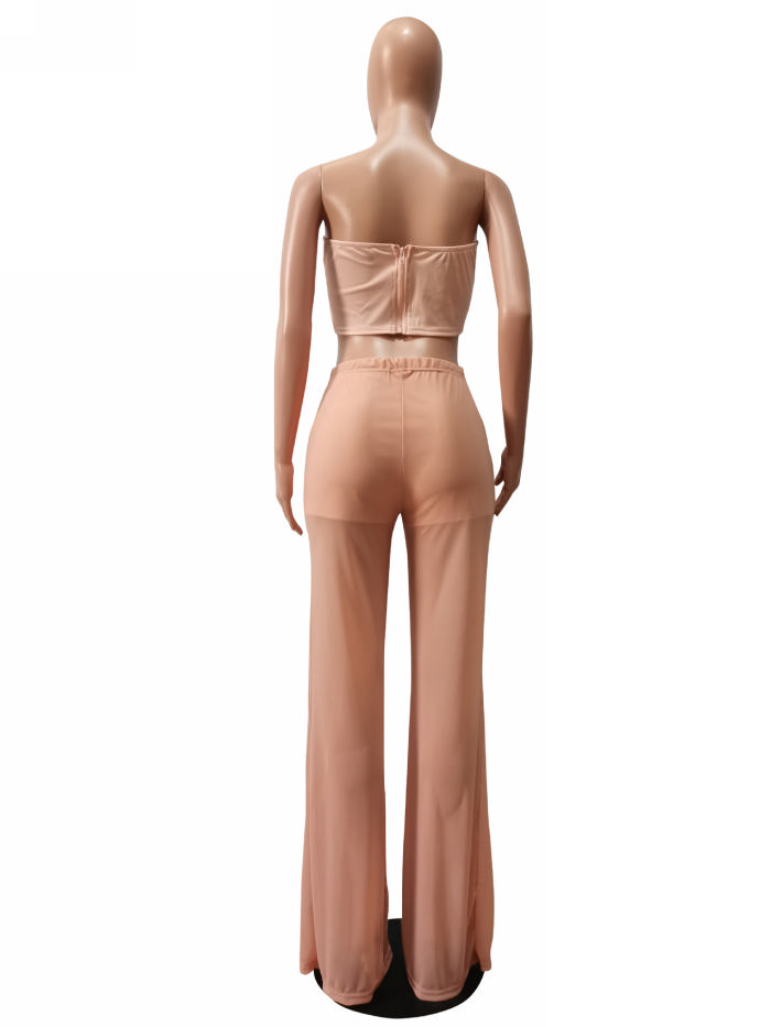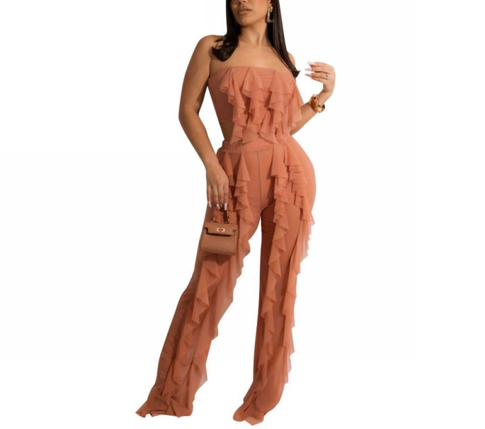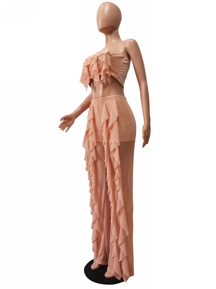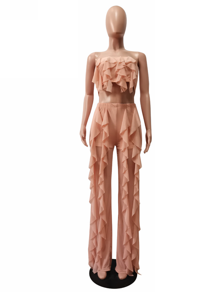 (Real Image)2022 Styles Women Fashion INS Styles Mesh Ruffle Solid Color Two Piece SuitSKU: #XF19191-2