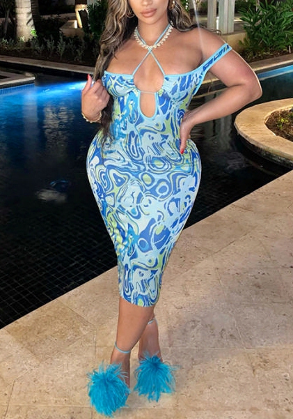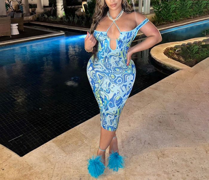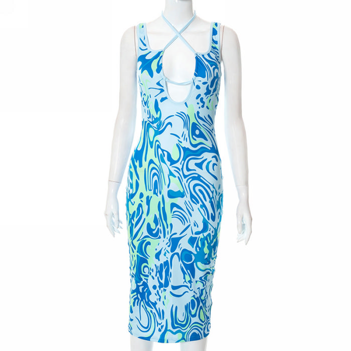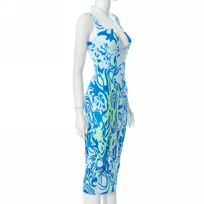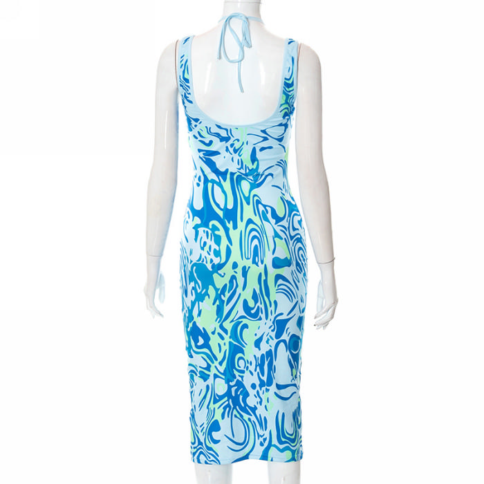 (Real Image)2022 Styles Women Fashion INS Styles Print Blue Halter Tie Midi DressSKU: #CF68007-1