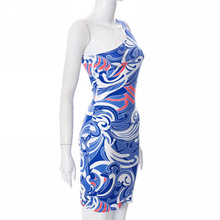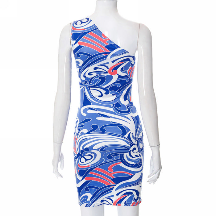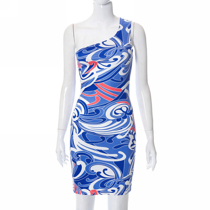 (Real Image)2022 Styles Women Fashion INS Styles Print Blue Single Shoulder Club DressSKU: #CF68052-1