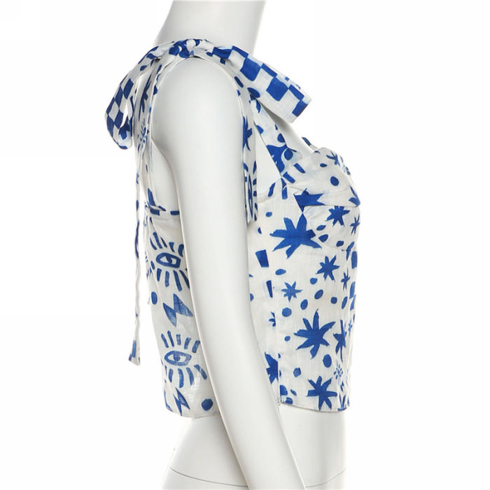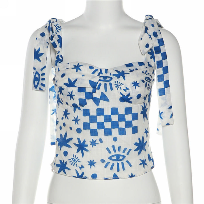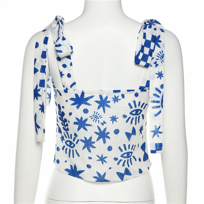 (Real Image)2022 Styles Women Fashion INS Styles Print Blue Tie Tank TopsSKU: #CF12300-1