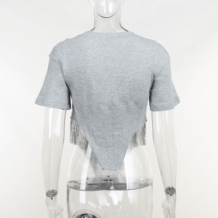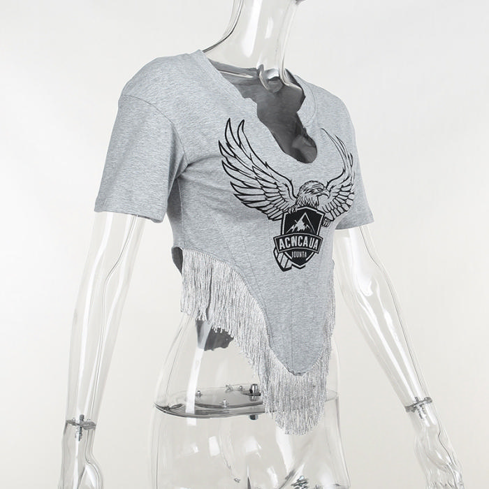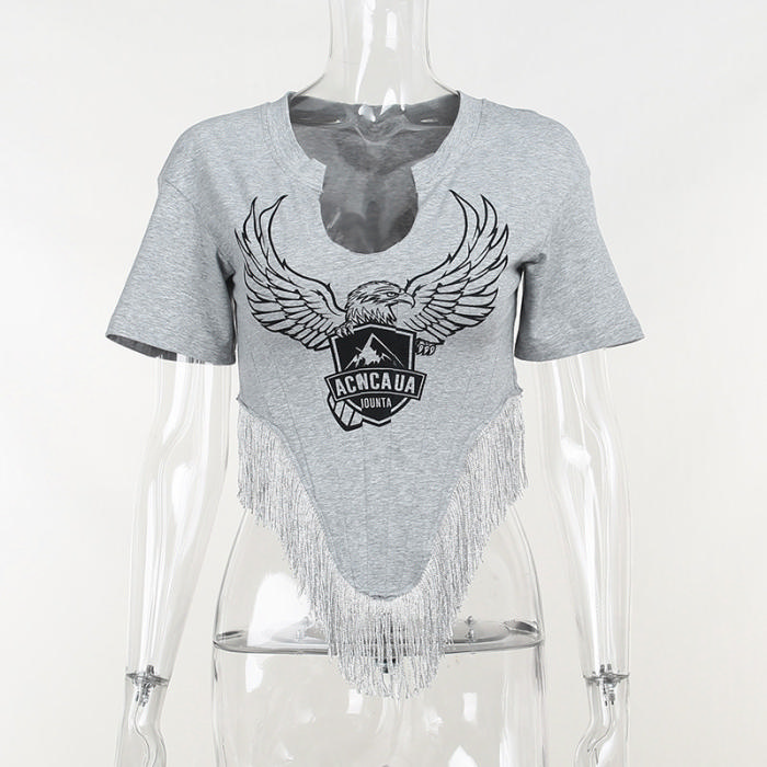 (Real Image)2022 Styles Women Fashion INS Styles Print Bottom Tassel TeeSKU: #XF92535-1