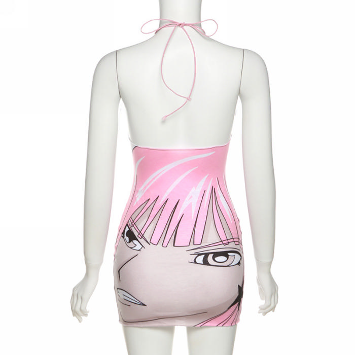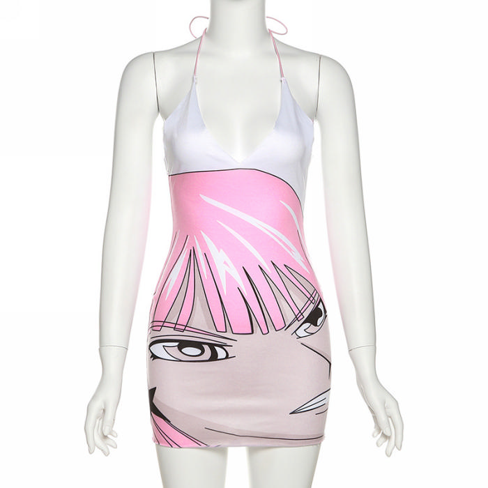 (Real Image)2022 Styles Women Fashion INS Styles Print Cartoon Halter Tie Mini DressSKU: #CF48719-1