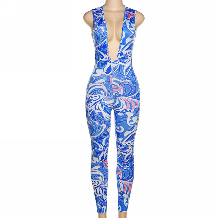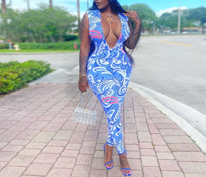 (Real Image)2022 Styles Women Fashion INS Styles Print Deep V Neck JumpsuitSKU: #CF49753-1