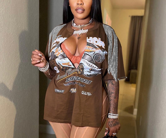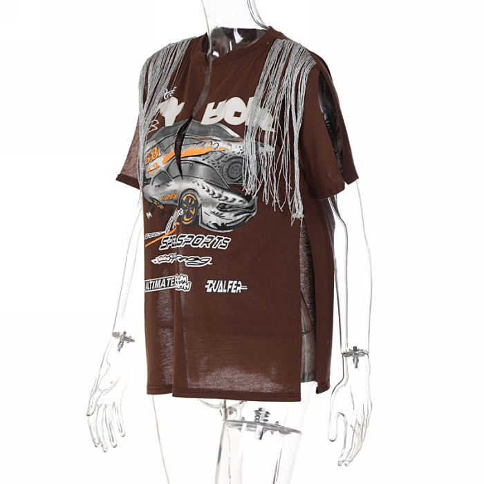 (Real Image)2022 Styles Women Fashion INS Styles Print Double Tassle TeeSKU: #OM0222-3