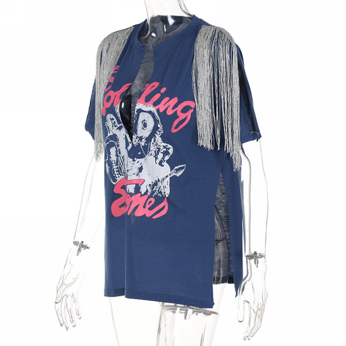(Real Image)2022 Styles Women Fashion INS Styles Print Double Tassle TeeSKU: #OM0222-2