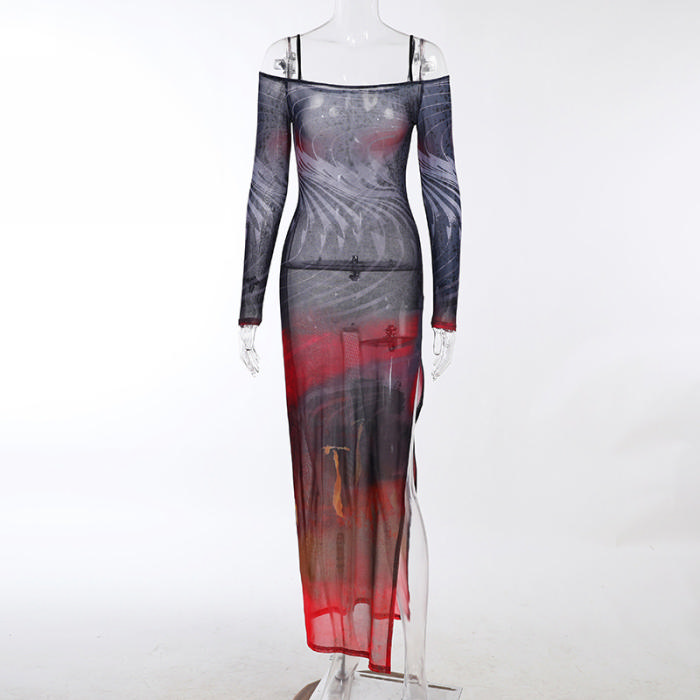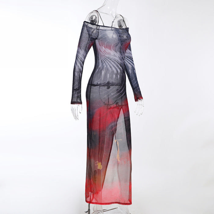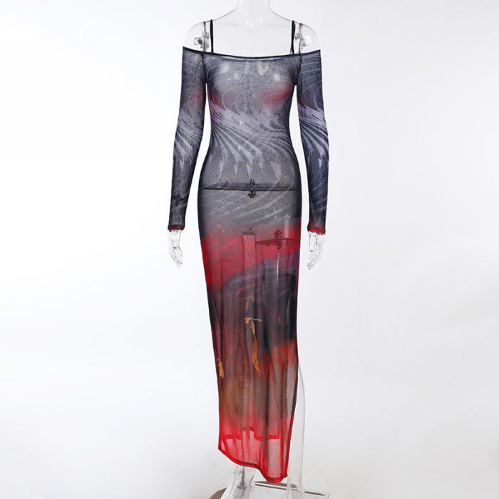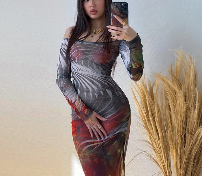 (Real Image)2022 Styles Women Fashion INS Styles Print Off Shoulder Maxi DressSKU: #XF92490-1