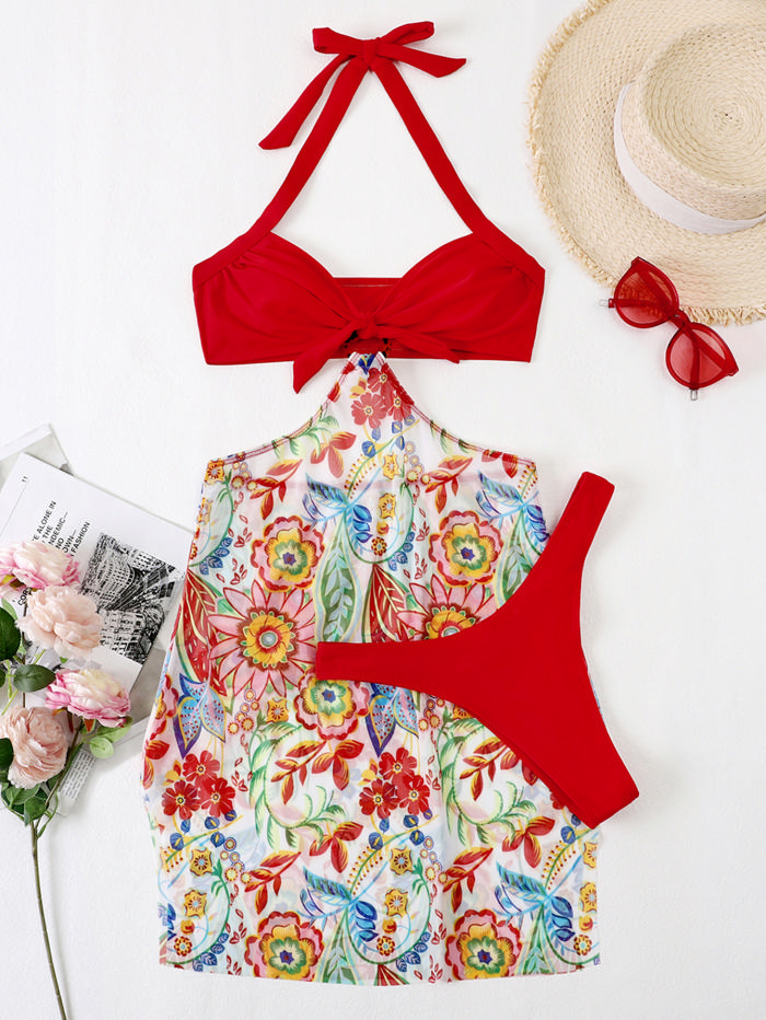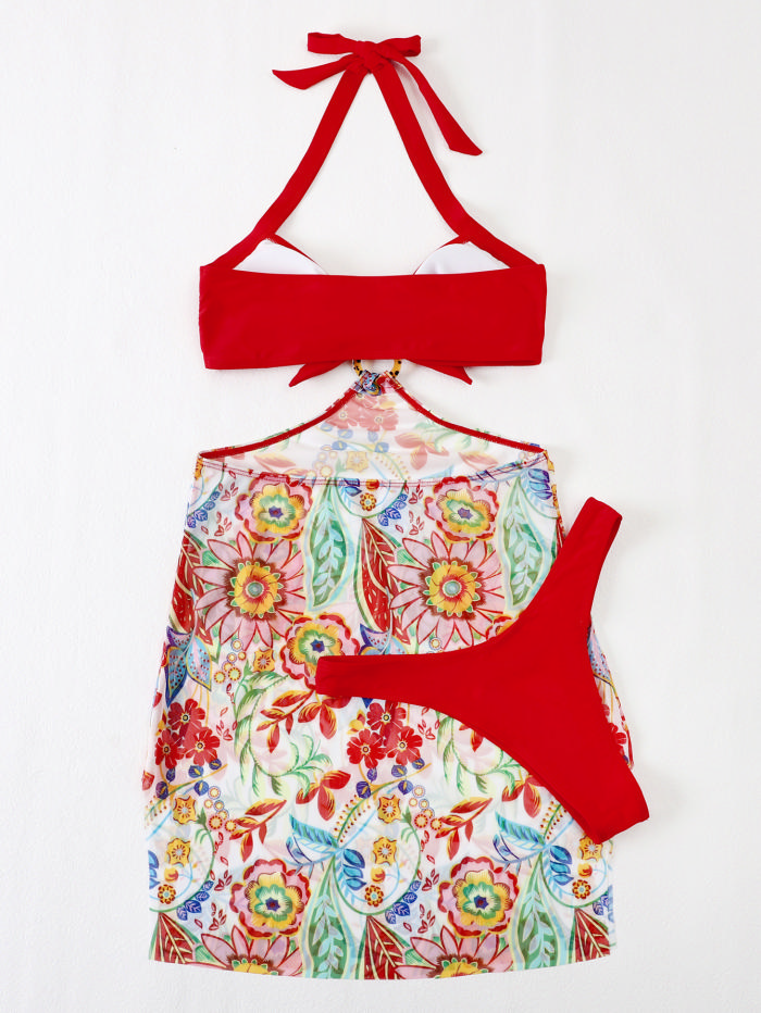 (Real Image)2022 Styles Women Fashion INS Styles Red Bikini Set+Floral Skirts 3 Piece SwimsuitSKU: #CF31167-1