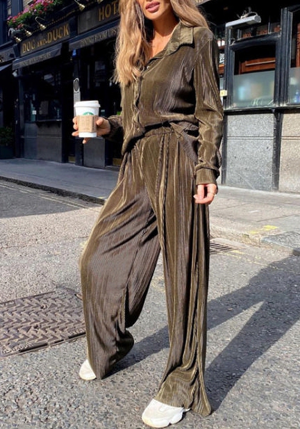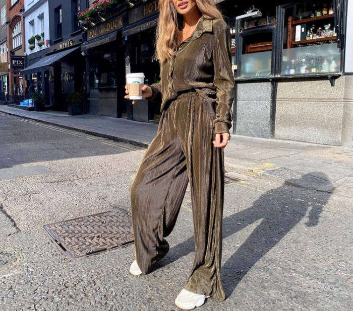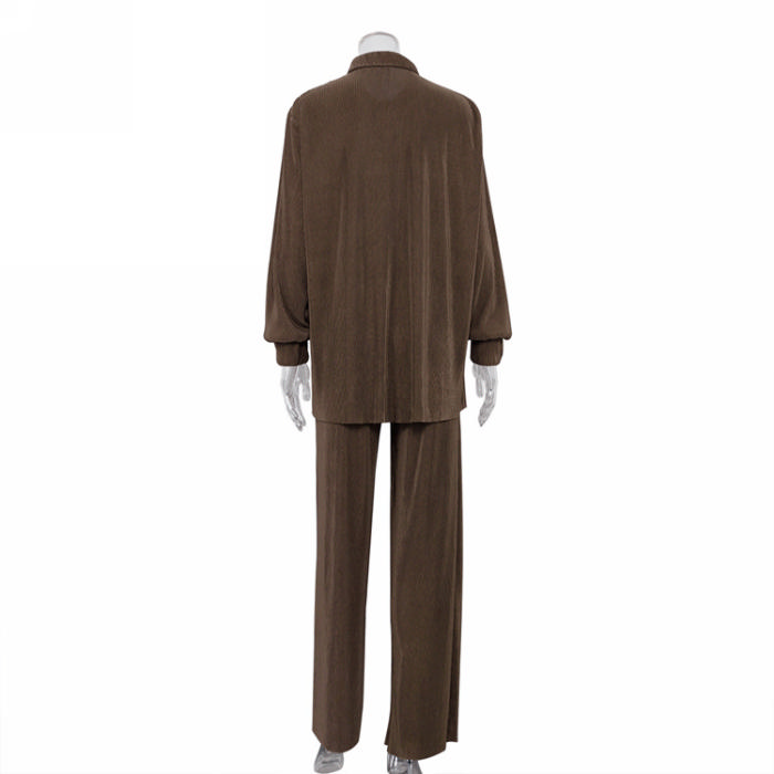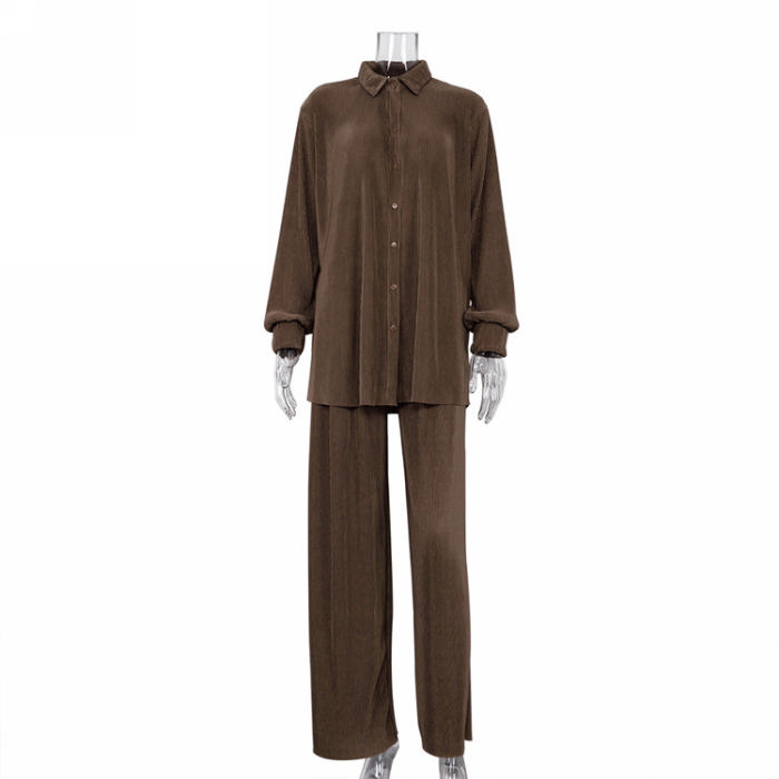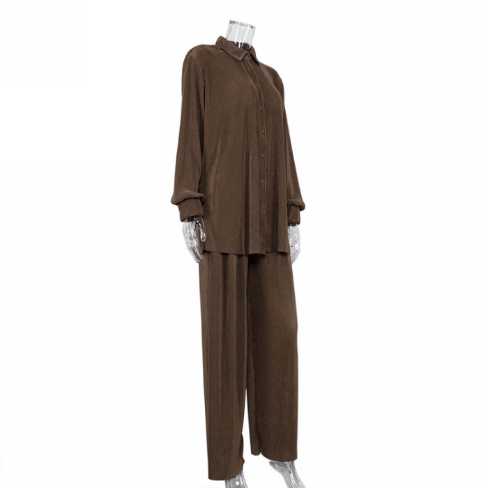(Real Image)2022 Styles Women Fashion INS Styles Rib Solid Color Two Piece Suit Front Shirts+Long PantsSKU: #CF72004-1
