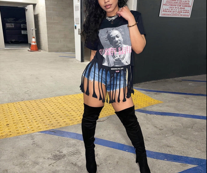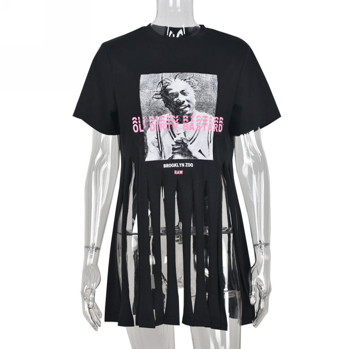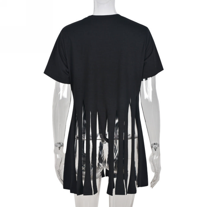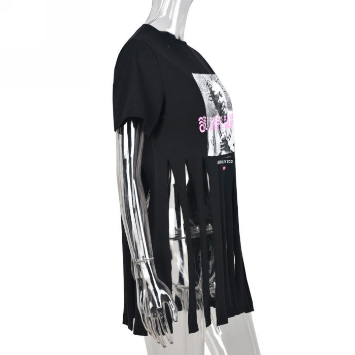 (Real Image)2022 Styles Women Fashion INS Styles Short Sleeve Black Print Bottom Tassel TopsSKU: #CF59087-1