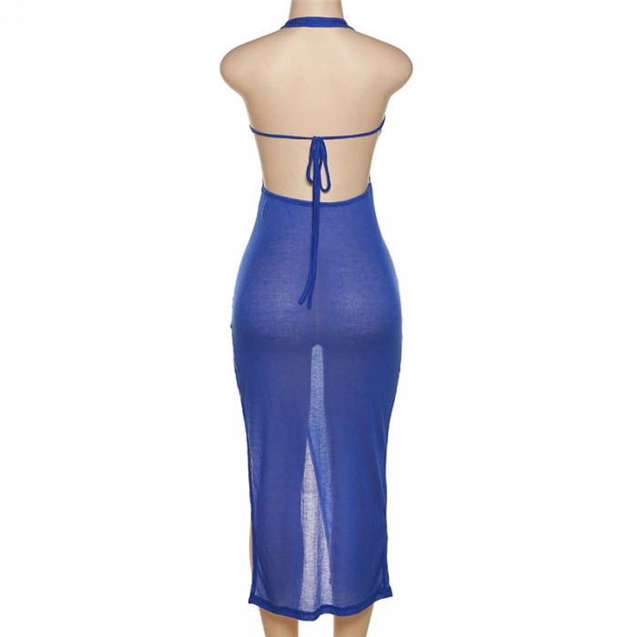(Real Image)2022 Styles Women Fashion Instagram Styles Blue Halter High Split Maxi DressSKU: #CF48749-1