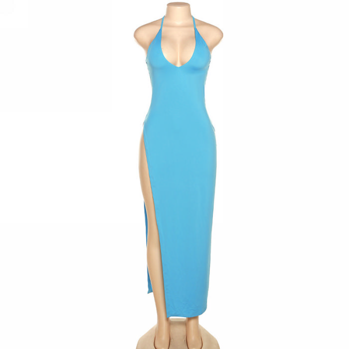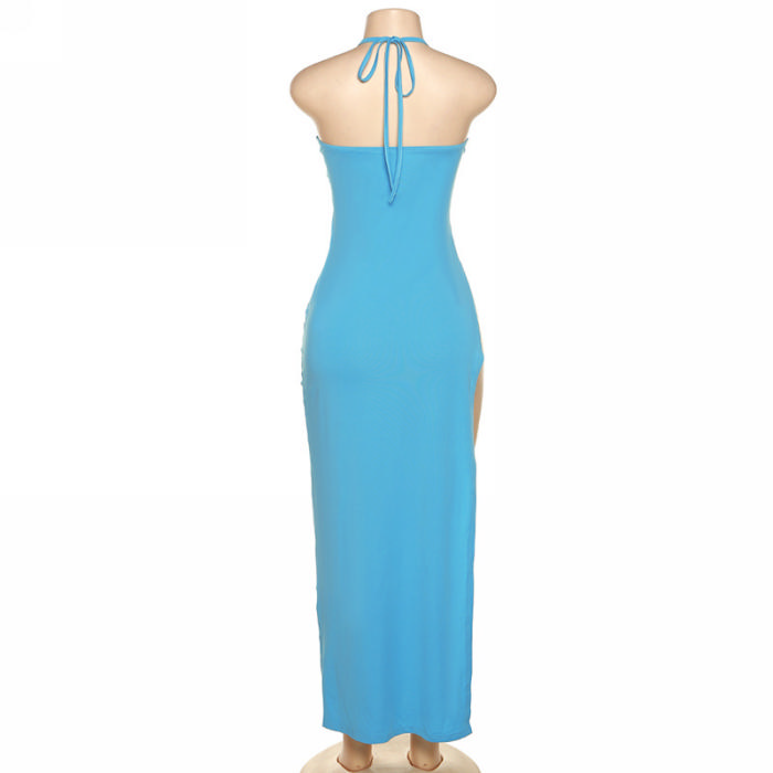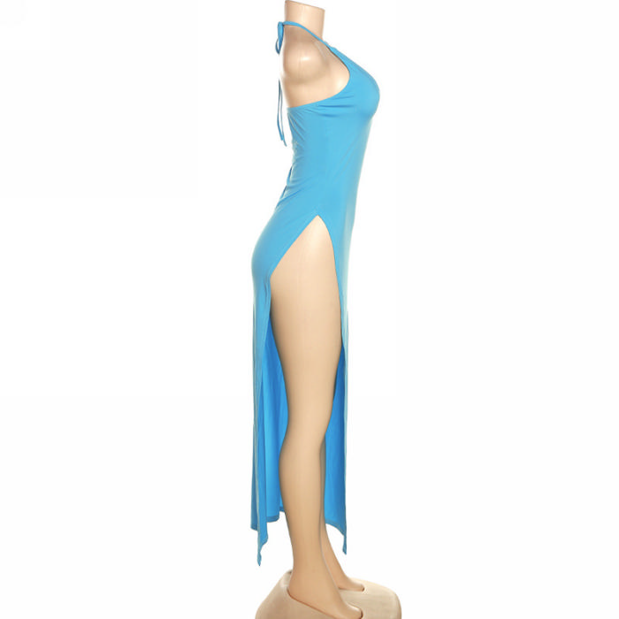 (Real Image)2022 Styles Women Fashion Instagram Styles Halter Blue High Split Maxi DressSKU: #CF12351-1