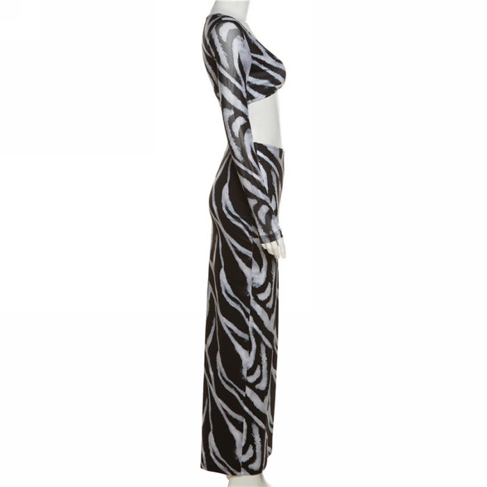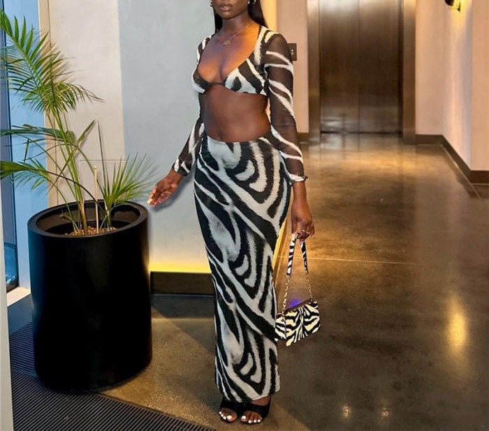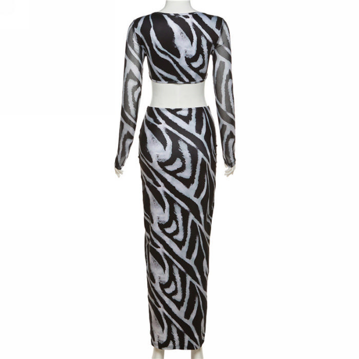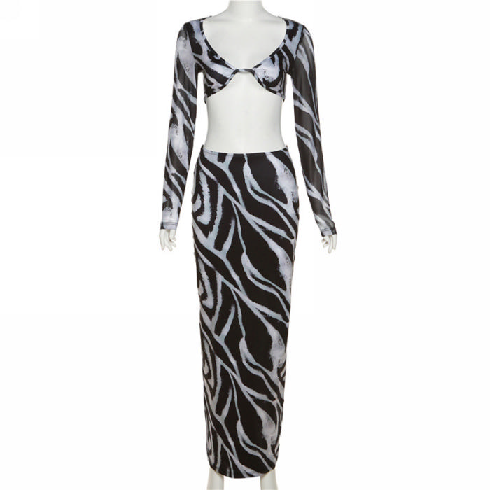 (Real Image)2022 Styles Women Fashion Instagram Styles Print Long Sleeve Crop Tops+Skirts Maxi DressSKU: #CF12352-1