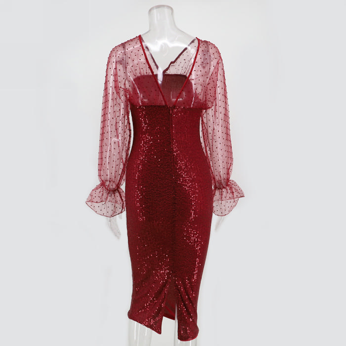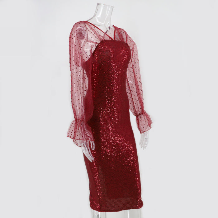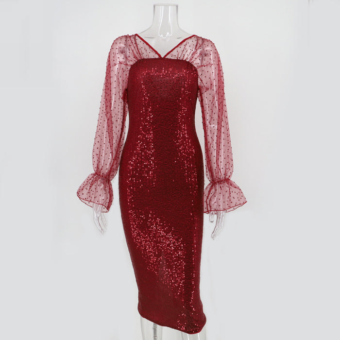 (Real Image)2022 Styles Women Fashion Spring INS Styles Sequin Mesh Long Sleeve Midi DressSKU: #OEM5241-1