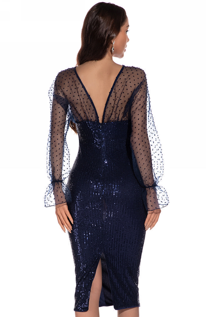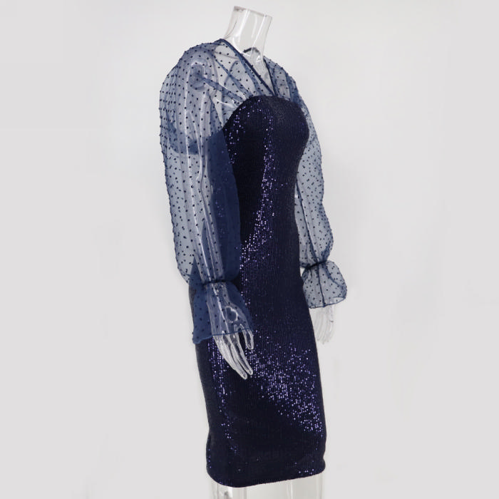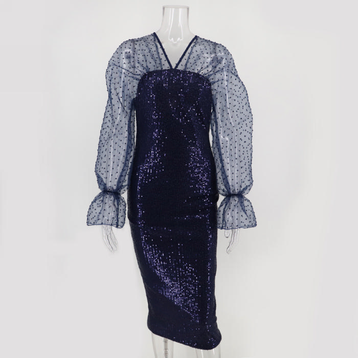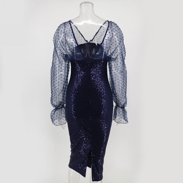 (Real Image)2022 Styles Women Fashion Spring INS Styles Sequin Mesh Long Sleeve Midi DressSKU: #OEM5241-2
