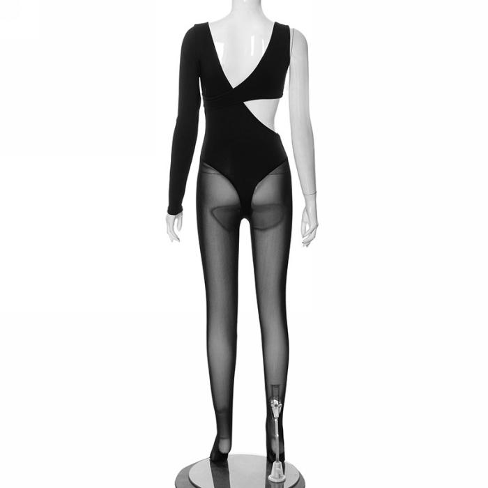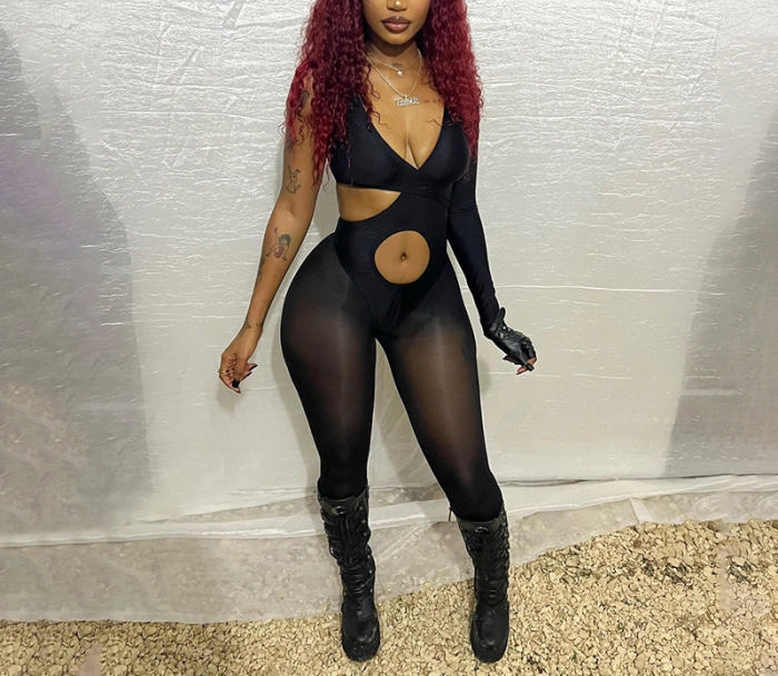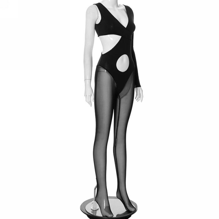 (Real Image)2022 Styles Women Fashion Spring&Winter TikTok&Instagram Styles Black Mesh Cut Out JumpsuitSKU: #CF65082-1