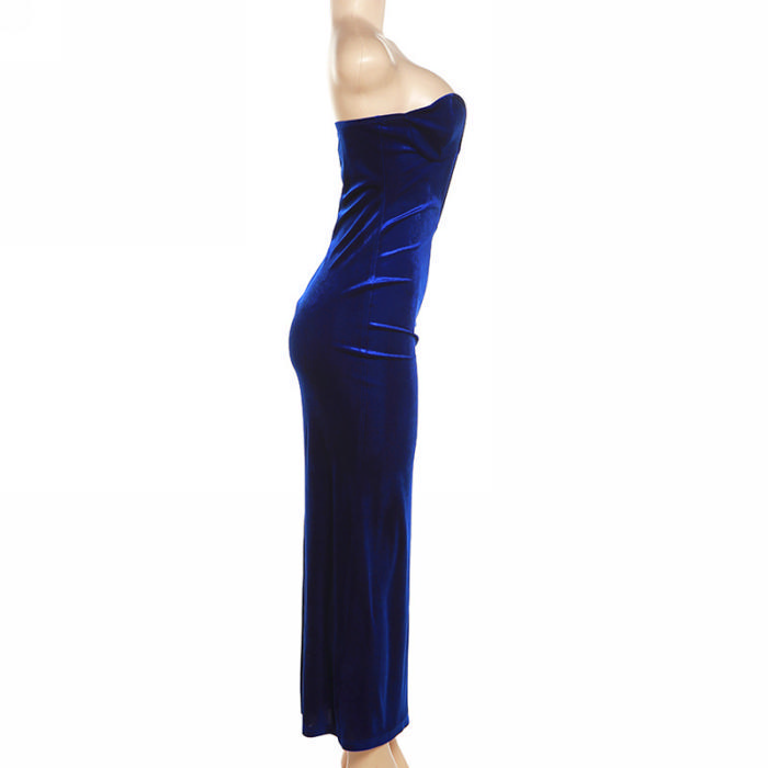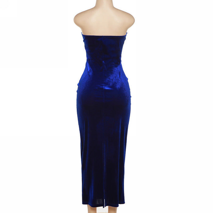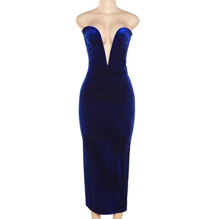 (Real Image)2022 Styles Women Fashion Spring&Winter TikTok&Instagram Styles Blue Velvet Deep V Neck Maxi DressSKU: #CF48908-1