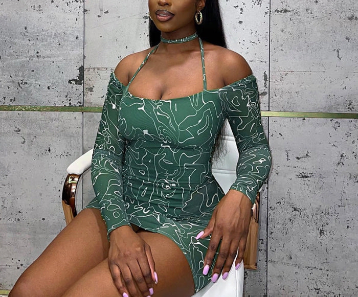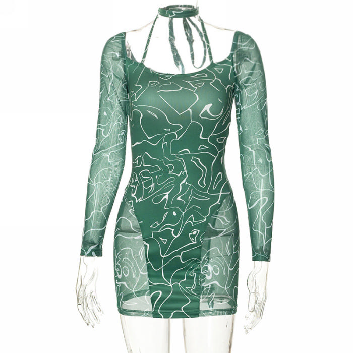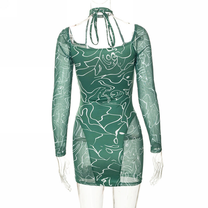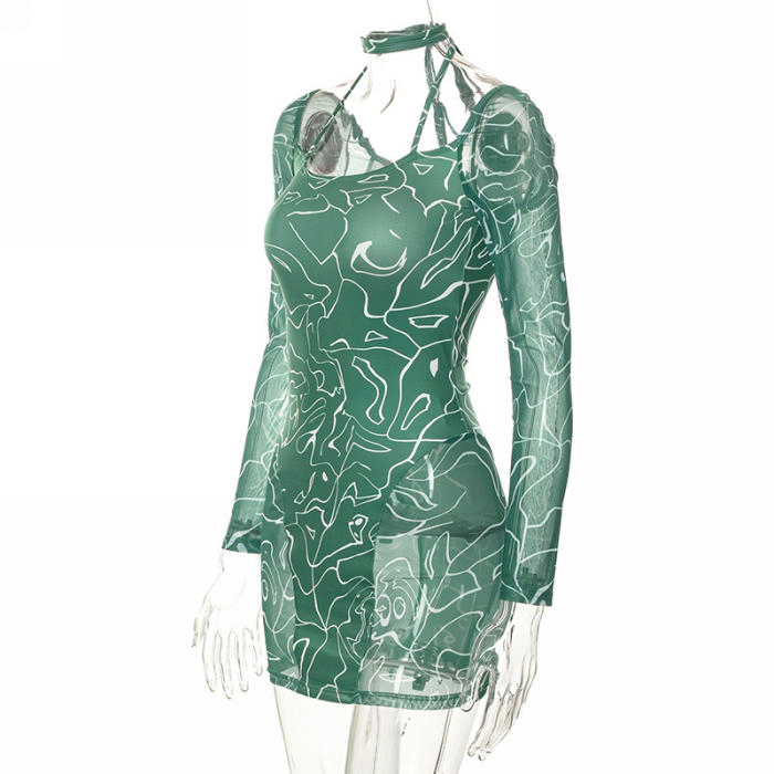 (Real Image)2022 Styles Women Fashion Spring&Winter TikTok&Instagram Styles Green Print Long Sleeve Mini DressSKU: #CF68126-1
