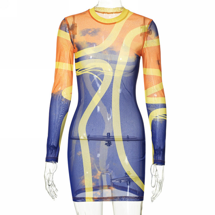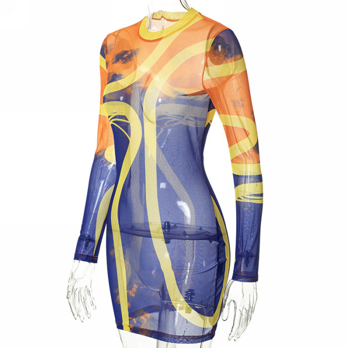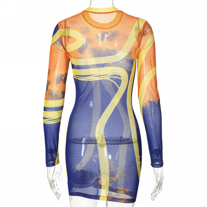 (Real Image)2022 Styles Women Fashion Spring&Winter TikTok&Instagram Styles Mesh Long Sleeve Print Mini DressSKU: #CF68170-1