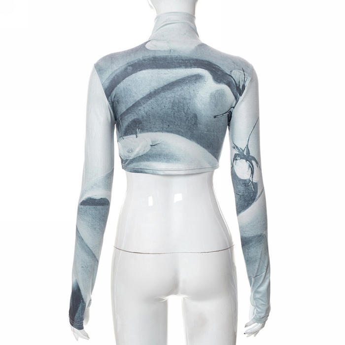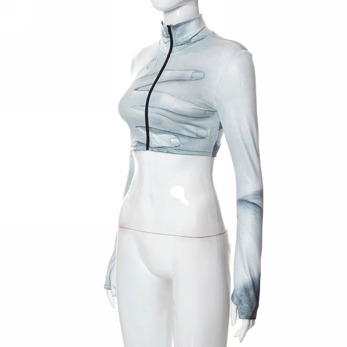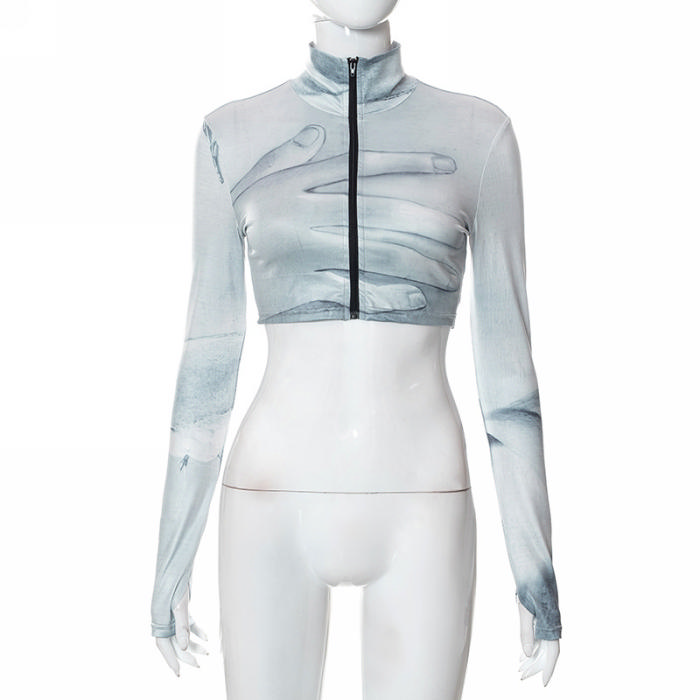 (Real Image)2022 Styles Women Fashion Spring&Winter TikTok&Instagram Styles Print Gray Front Zipper Long Sleeve CoatSKU: #CF68104-1