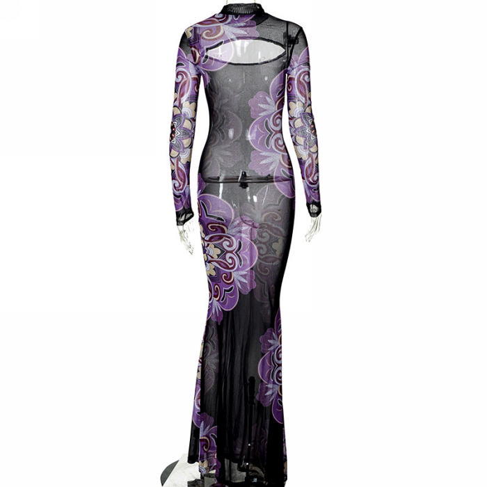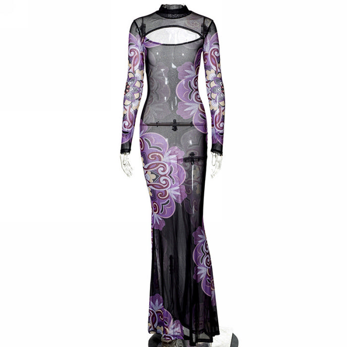 (Real Image)2022 Styles Women Fashion Spring&Winter TikTok&Instagram Styles Purple Mesh Long Sleeve Maxi DressSKU: #CF68149-1