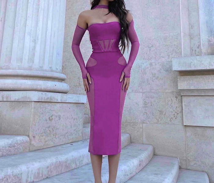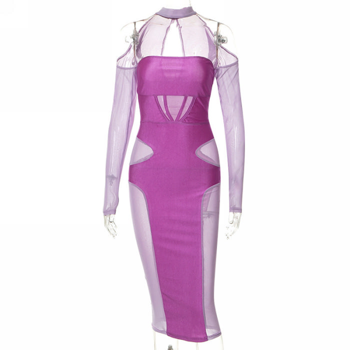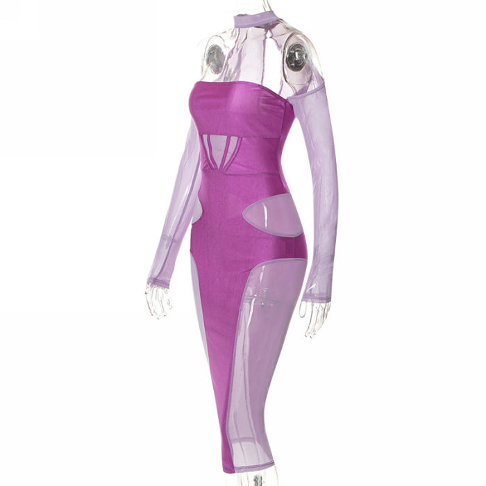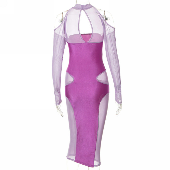 (Real Image)2022 Styles Women Fashion Spring&Winter TikTok&Instagram Styles Purple Mesh Off Shoulder Long Sleeve Maxi DressSKU: #CF68153-1
