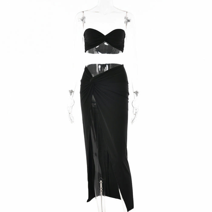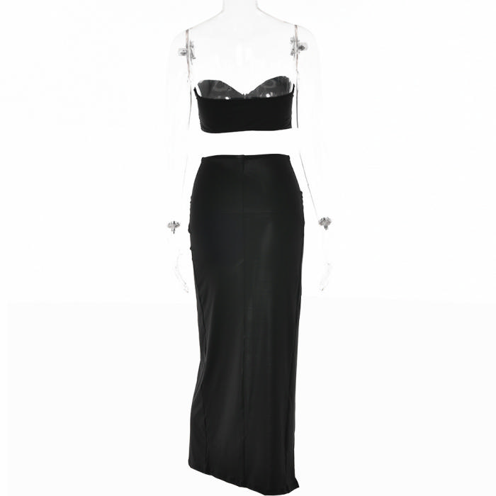 (Real Image)2022 Styles Women Fashion Spring&Winter TikTok&Instagram Styles Solid Color Bar+Maxi Skirts Two Piece SuitSKU: #XF62579-2