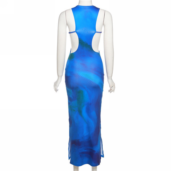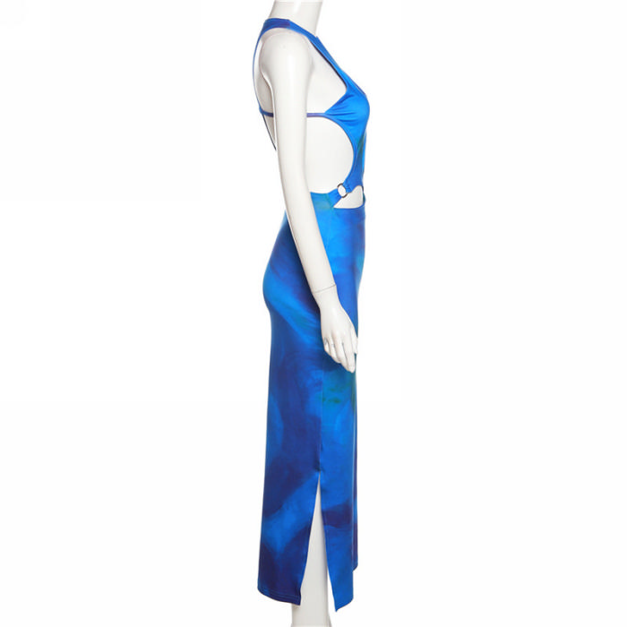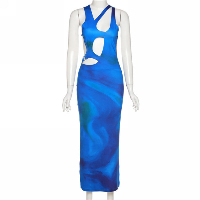 (Real Image)2022 Styles Women Fashion Summer INS Styles Blue Cut Out Maxi DressSKU: #CF49603-1