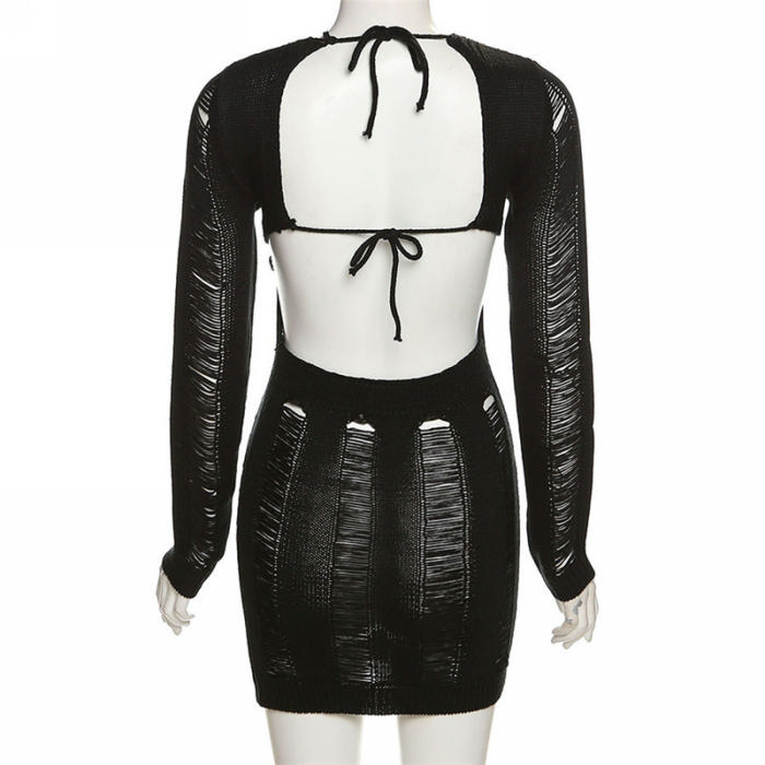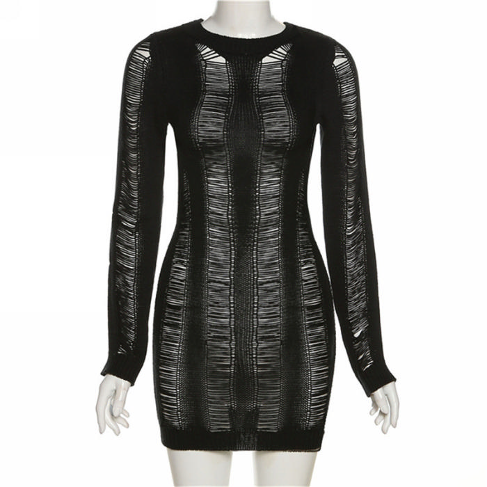 (Real Image)2022 Styles Women Fashion Summer INS Styles Long Sleeve Ripped Sweater Mini DressSKU: #CF49643-1