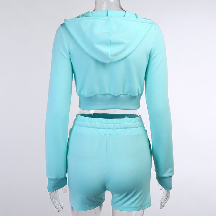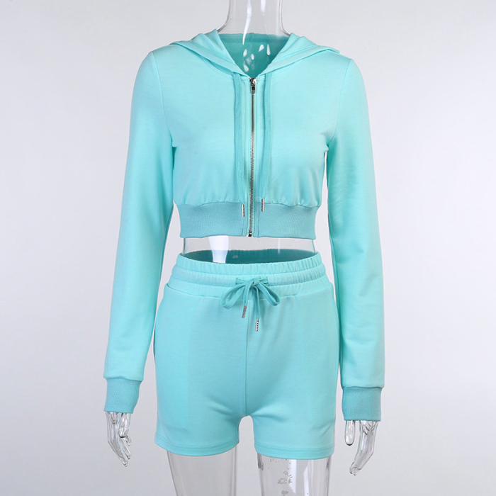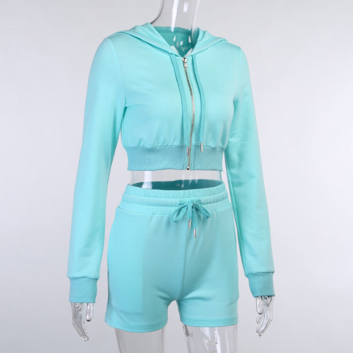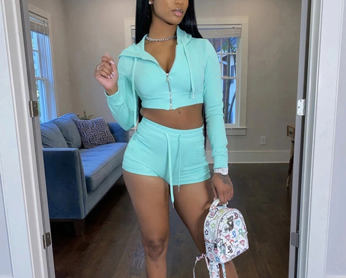 (Real Image)2022 Styles Women Fashion Summer INS Styles Solid Color Hoodie Front Zipper Tops + Short Pants 2 Pieces SuitSKU: #XF92450-1