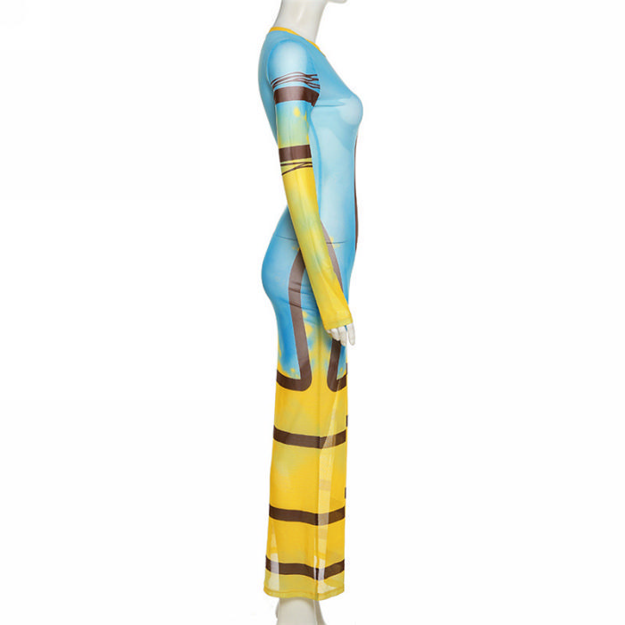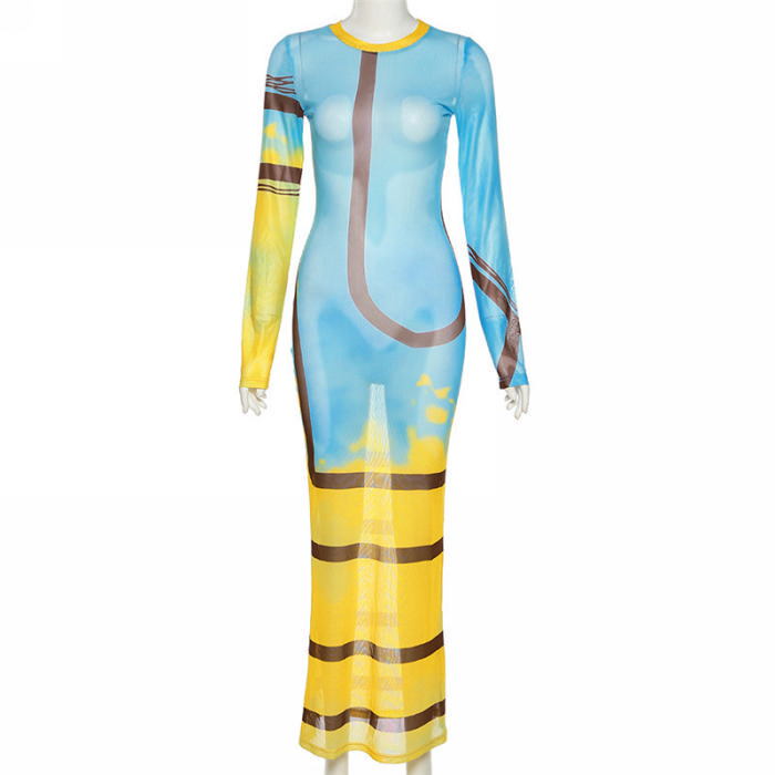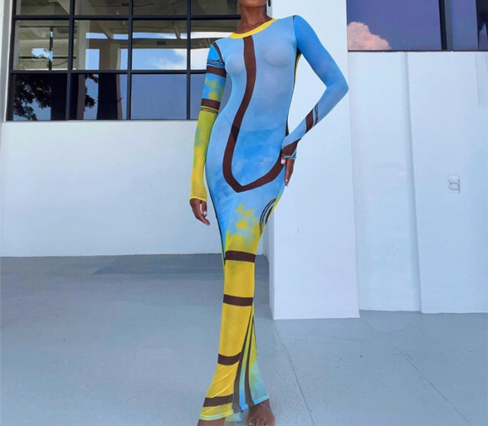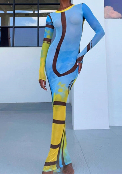 (Real Image)2022 Styles Women Fashion Summer TikTok&Instagram Styles Blue Mesh Long Sleeve Maxi DressSKU: #CF48840-1