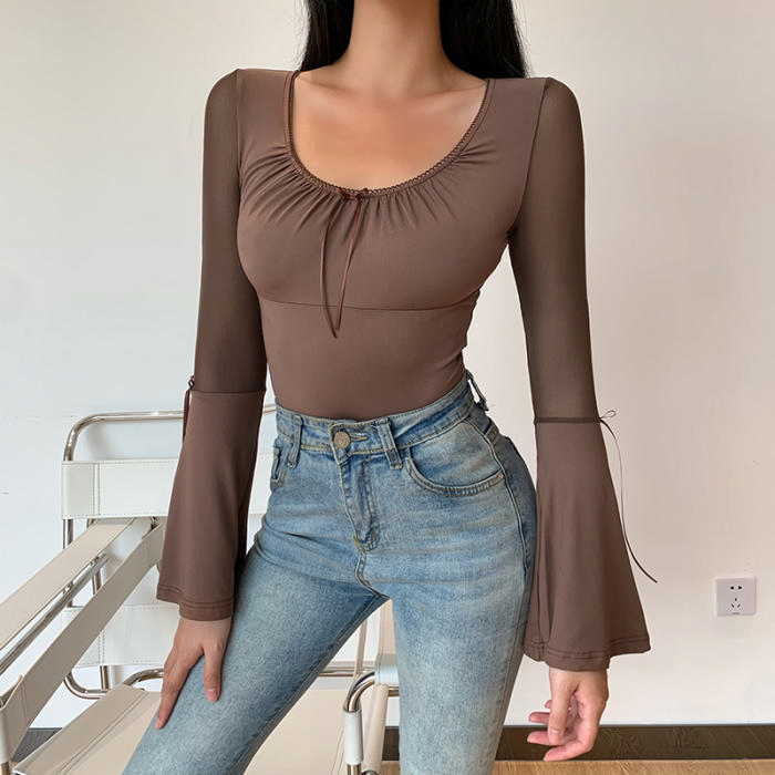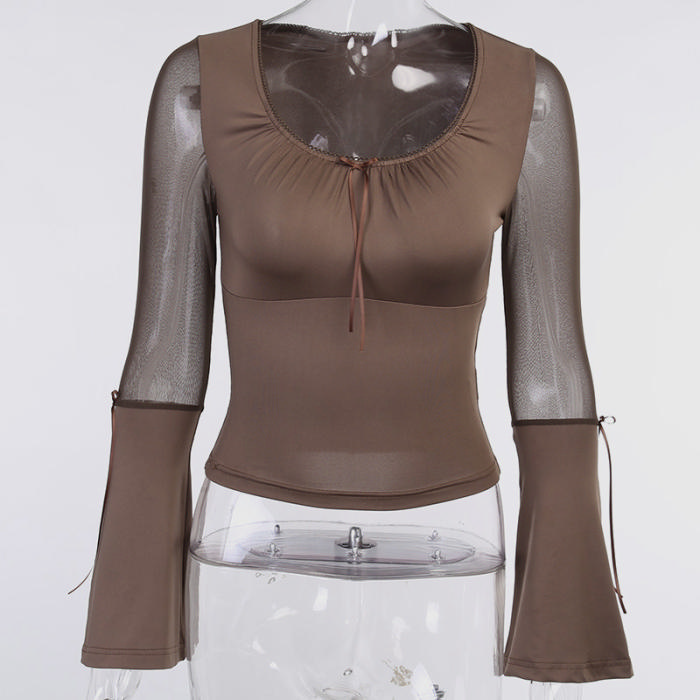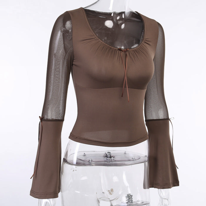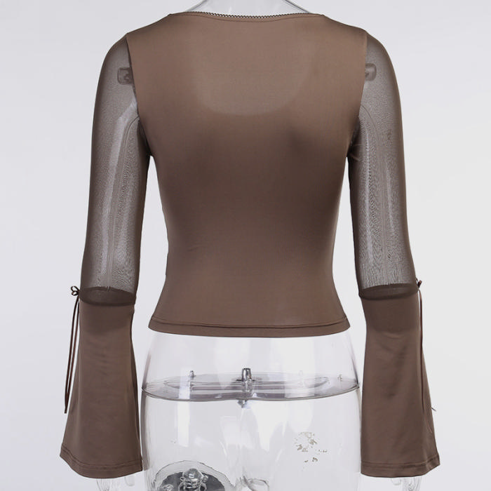 (Real Image)2022 Styles Women Fashion Summer TikTok&Instagram Styles Brown Mesh Long Sleeve TopsSKU: #XF92652-1