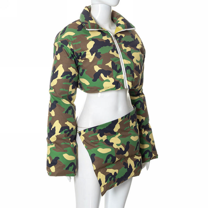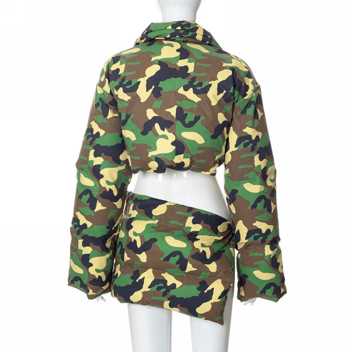 (Real Image)2022 Styles Women Fashion Summer TikTok&Instagram Styles Camouflage Long Sleeve Front Zipper Coat+SkirtsSKU: #CF47293-1