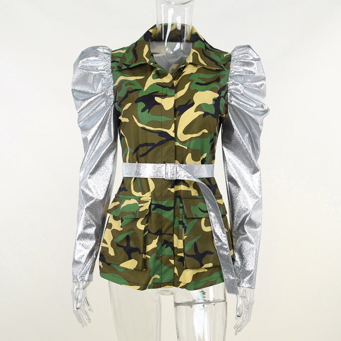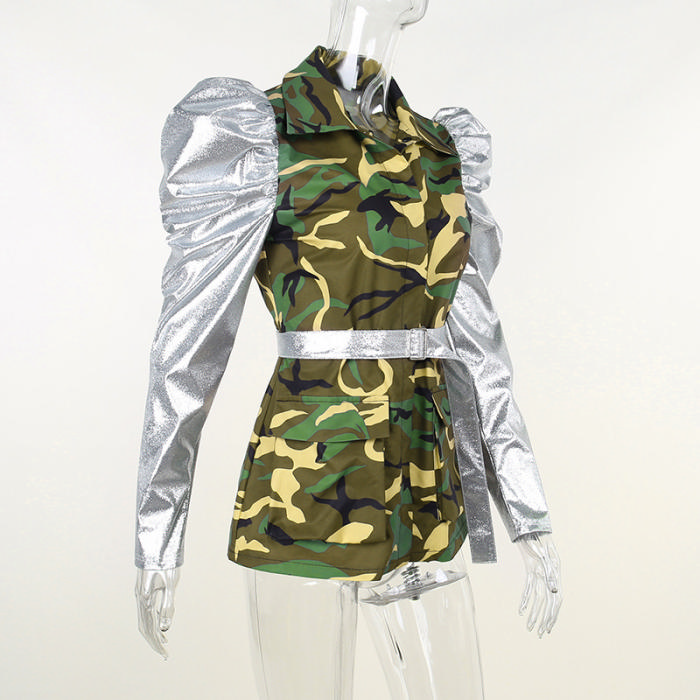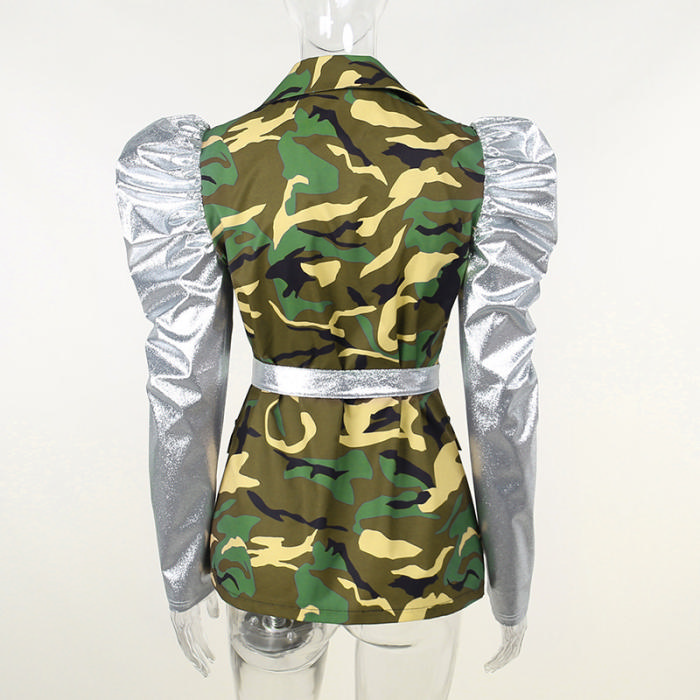 (Real Image)2022 Styles Women Fashion Summer TikTok&Instagram Styles Camouflage Silver Puff Long Sleeve Short CoatsSKU: #XF92635-1