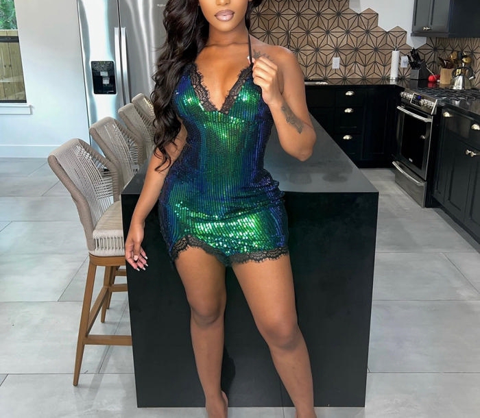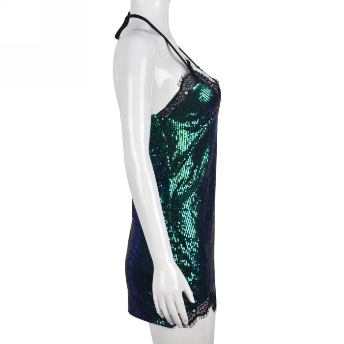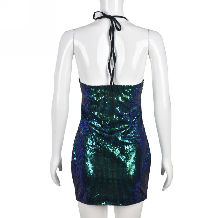 (Real Image)2022 Styles Women Fashion Summer TikTok&Instagram Styles Green Sequin Strap Backless Mini DressSKU: #CF59247-1